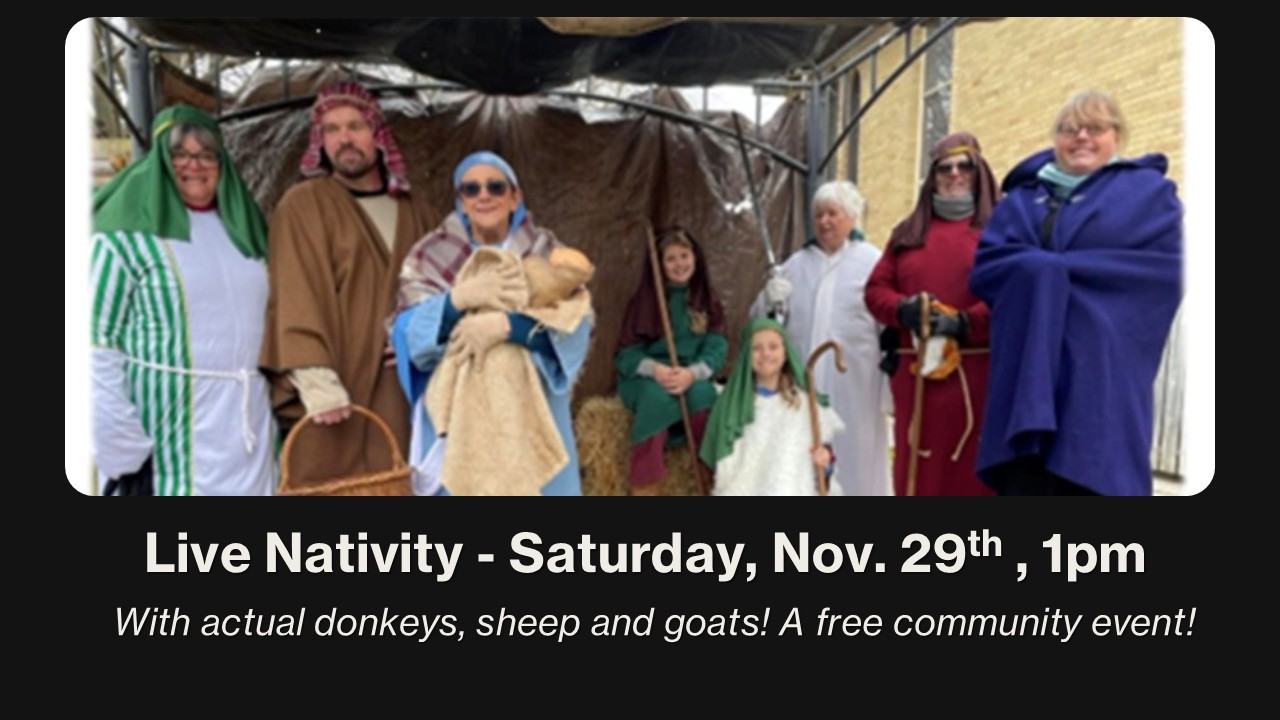 Please join us as we reenact the First Christmas with live animals. This is an indoor/outdoor event so please dress in layers. After the play finishes we welcome you to come in for some hot chocolate. Hope to see you there!